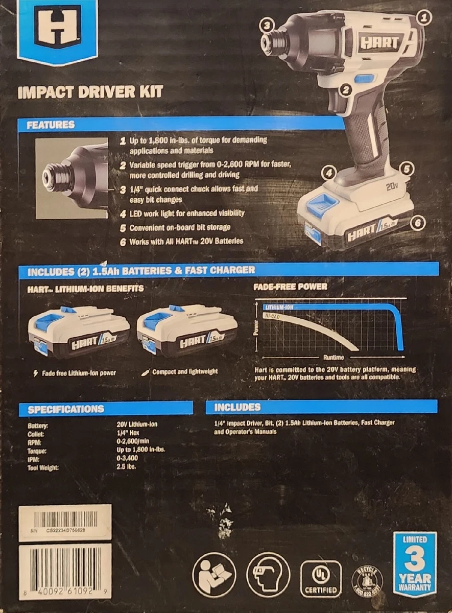 Hart Hpid02b2 20v Impact Driver Kit Brand New W 2 Batteries And Fast Charger Ebay